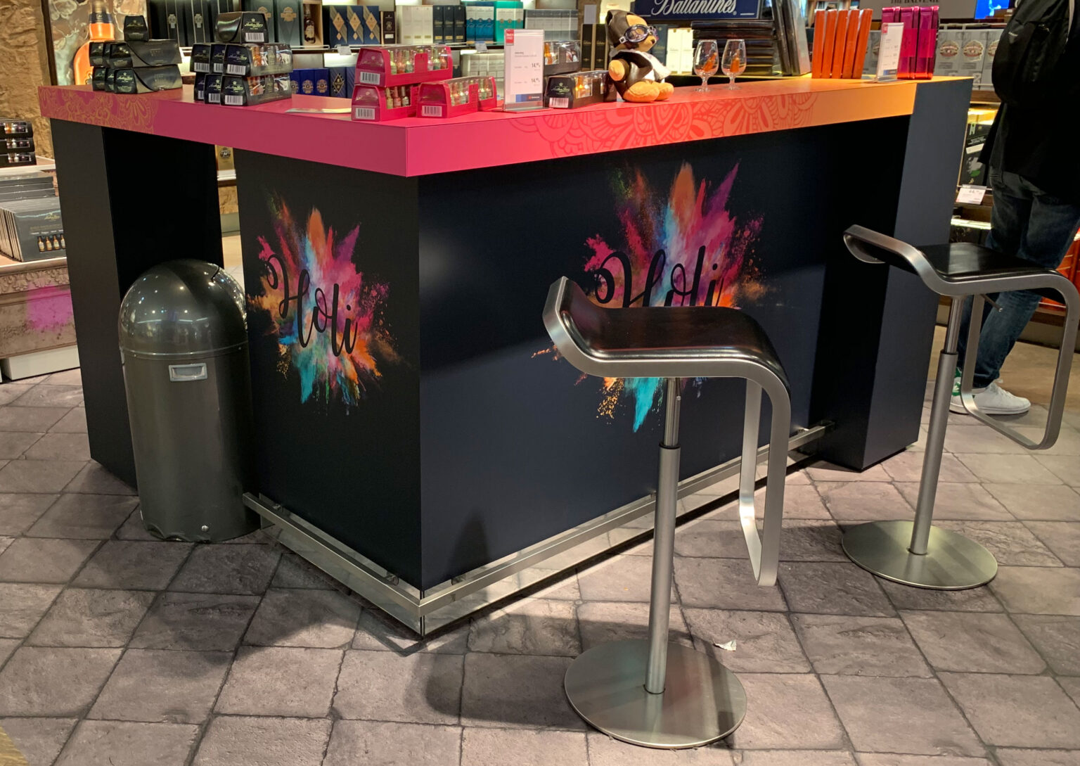 Thekenverkleidung und Bodenfolie für Promo-Aktion zum Holi-Fest